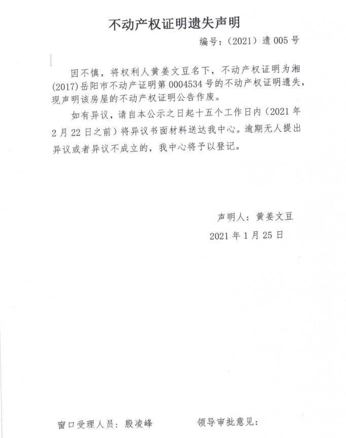 不动产权证明遗失声明 编号:(2021)遗05号(黄姜、文豆)