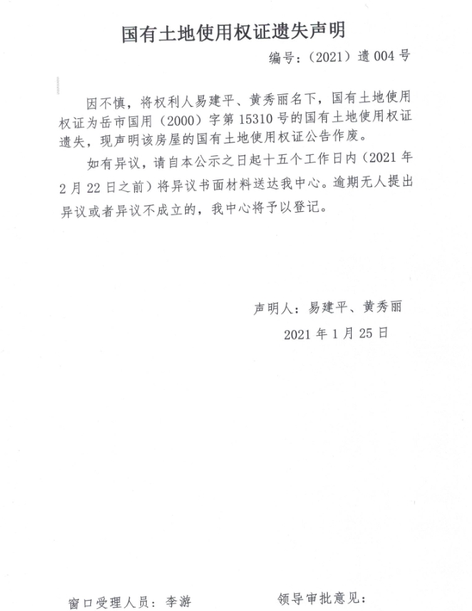 国有土地使用权证遗失声明 编号:(2021)遗004号(易建平、黄秀丽)