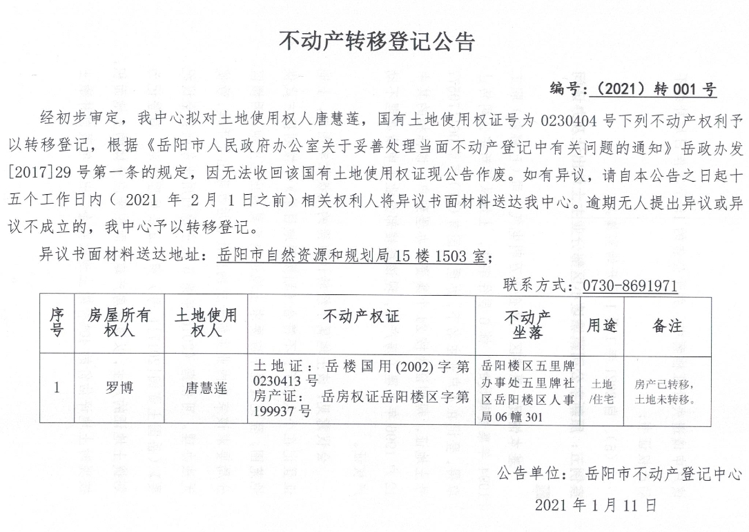 不动产转移登记公告 编号:(2021)转001号(唐慧莲)