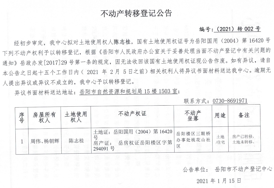 不动产转移登记公告 编号:(2021)转002号(陈志桂)