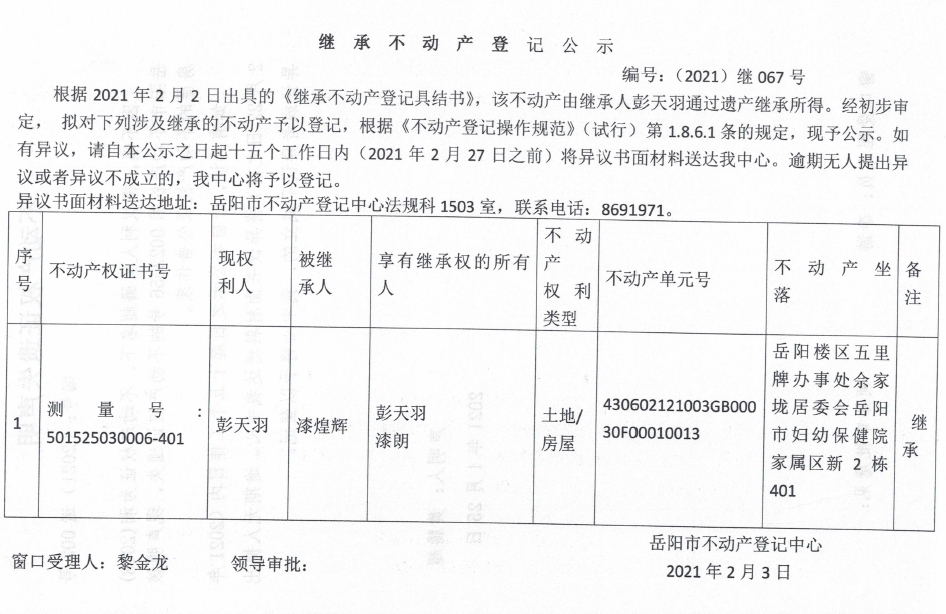 继承不动产登记公示 编号:(2021)继067号(彭天羽)
