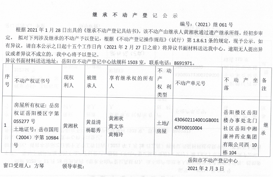 继承不动产登记公示 编号:(2021)继061号(黄湘秋)