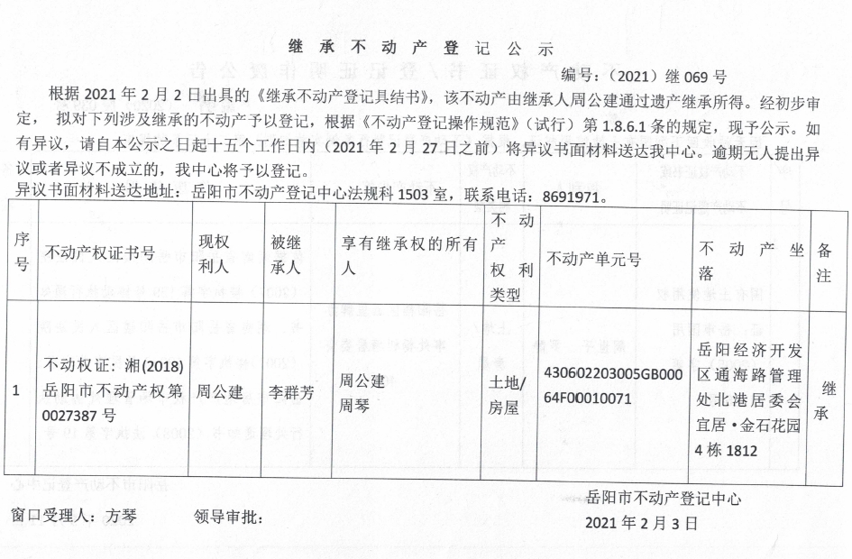 继承不动产登记公示 编号:(2021)继069号(周公建)