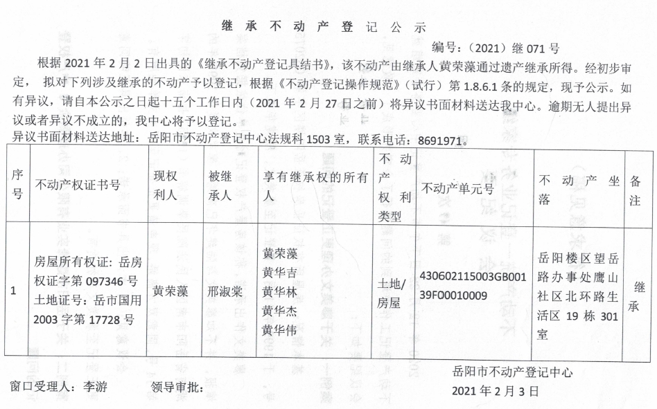 继承不动产登记公示 编号:(2021)继071号(黄荣藻)