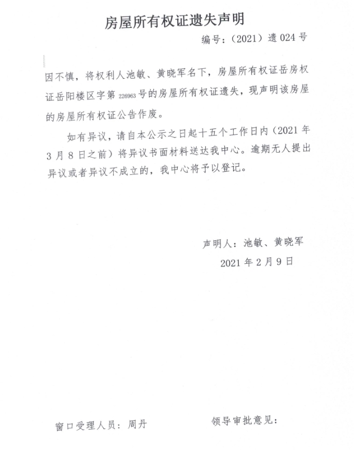 房屋所有权证遗失声明 编号:(2021)遗024号(池敏、黄晓军)