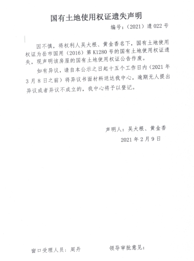国有土地使用权证遗失声明 编号:(2021)遗022号(吴大根、黄金香)