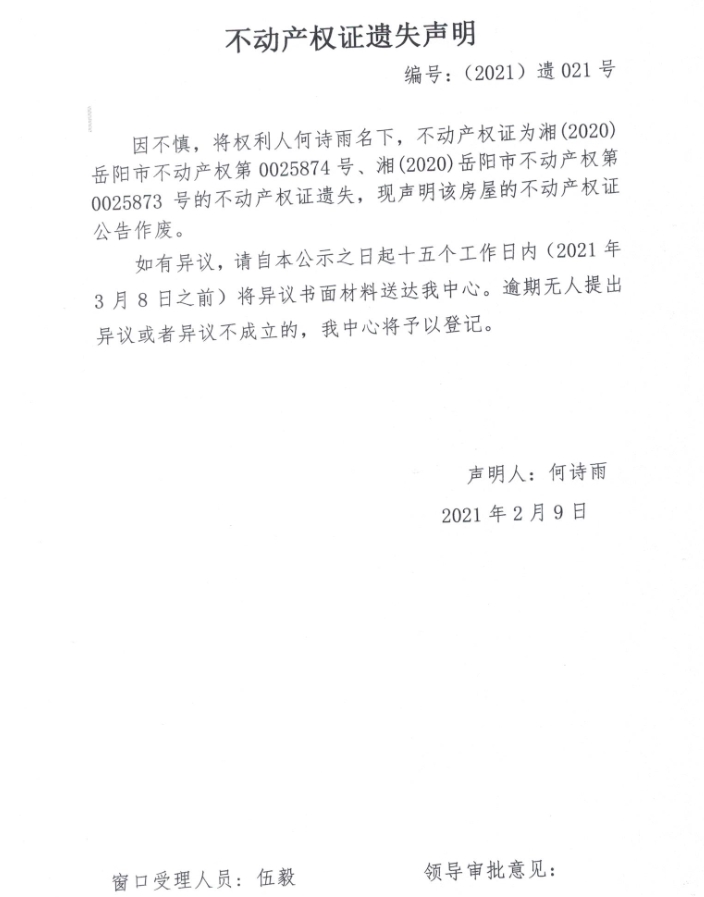 不动产权证遗失声明 编号:(2021)遗021号(何诗雨)