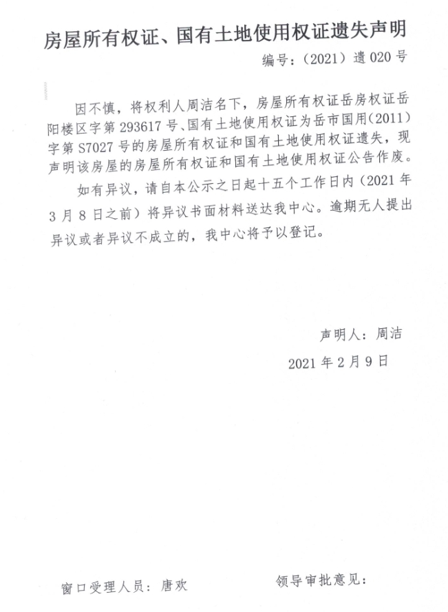 房屋所有权证、国有土地使用权证遗失声明 编号:(2021)遗020号(周洁)
