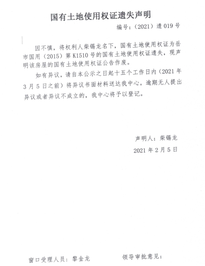 国有土地使用权证遗失声明 编号:(2021)遗019号(柴锡龙)