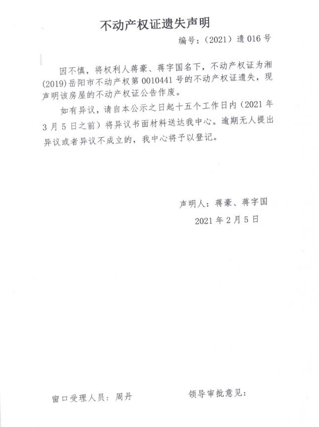 不动产权证遗失声明 编号:(2021)遗016号(蒋豪、蒋字国)