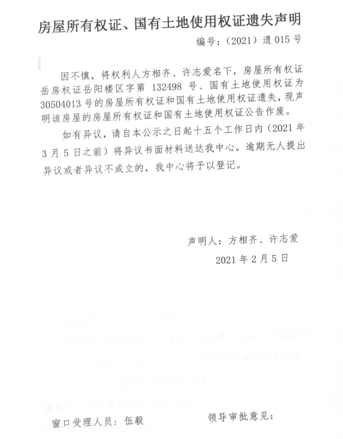 房屋所有权证、国有土地使用权证遗失声明 编号:(2021)遗015号(方相齐、许志爱)