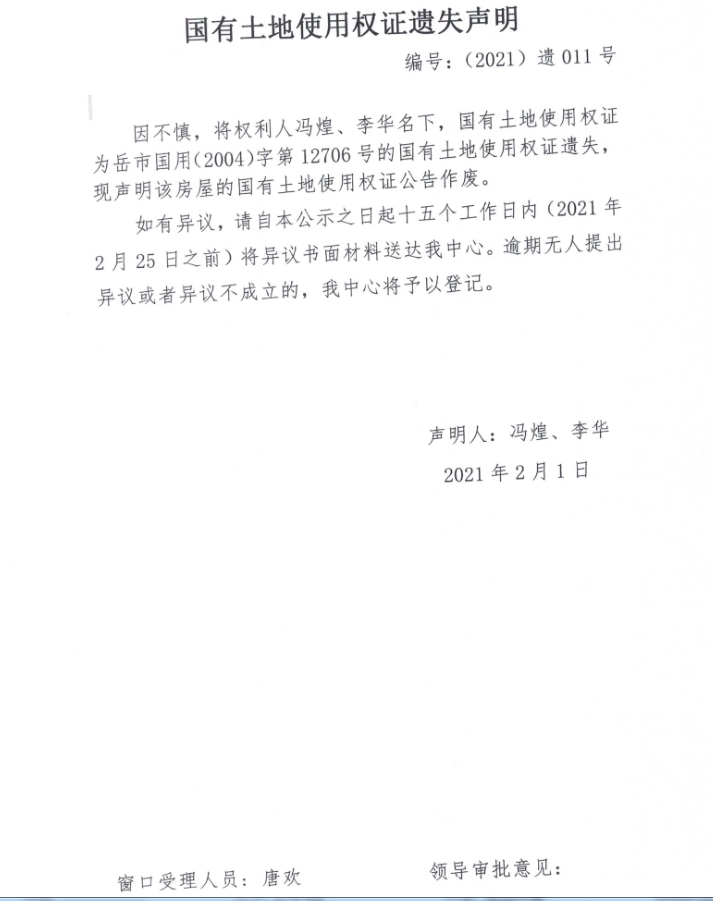 房屋所有权证、国有土地使用权证遗失声明 编号:(2021)遗011号(冯煌、李华)
