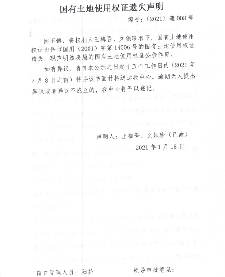 不动产权证明遗失声明 编号:(2021)遗008号(王梅吾、文领珍)