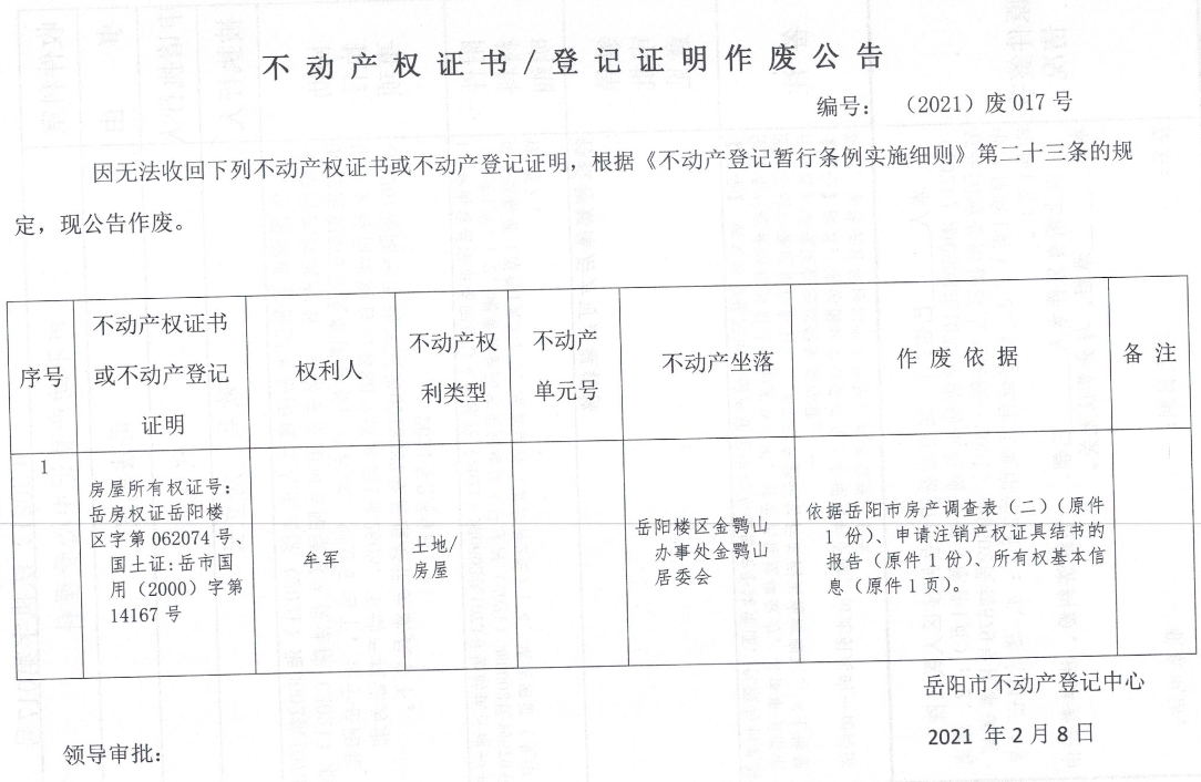 不动产权证书、登记证明作废公告 编号: (2021)废017号(牟军)