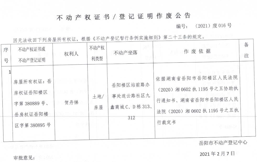 不动产权证书、登记证明作废公告 编号: (2021)废016号(贺丹悌)