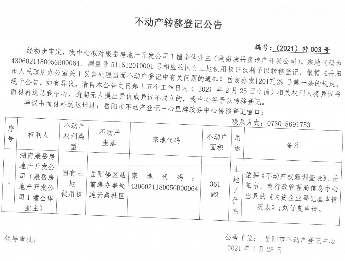 不动产转移登记公告 编号:(2021)转003号(湖南康岳房地产开发公司)