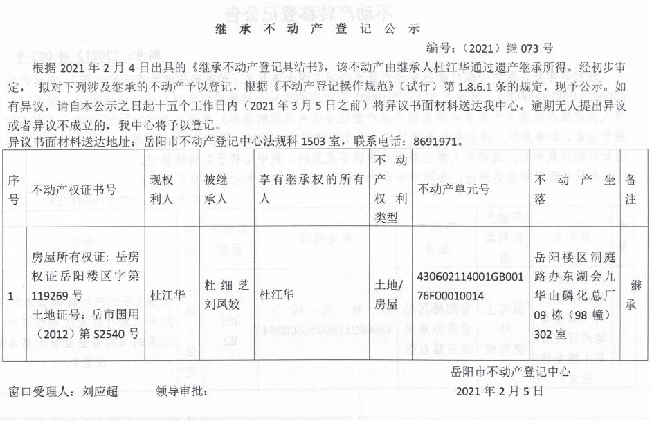 继承不动产登记公示 编号:(2021)继073号(杜江华)