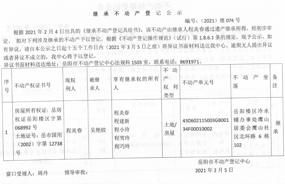 继承不动产登记公示 编号:(2021)继074号(程炎春)