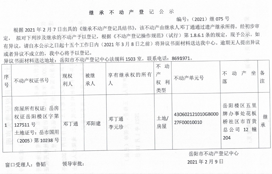 继承不动产登记公示 编号:(2021)继075号(邓丁通)