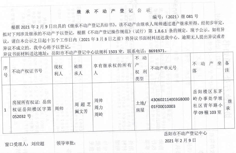 继承不动产登记公示 编号:(2021)继081号(周帅)