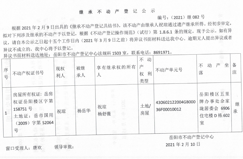 继承不动产登记公示 编号:(2021)继082号(祝琼)