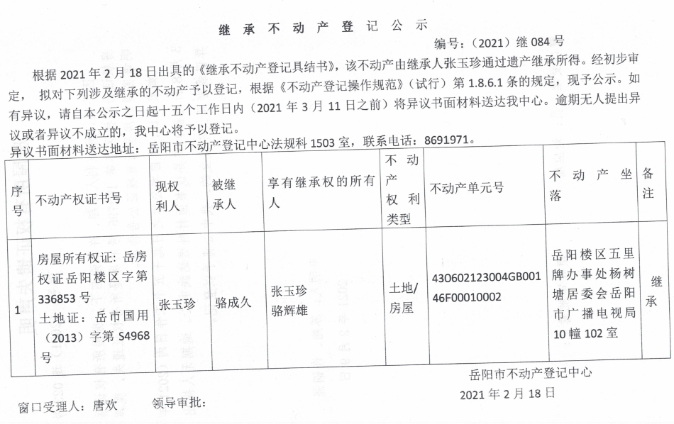 继承不动产登记公示 编号:(2021)继084号(张玉珍)