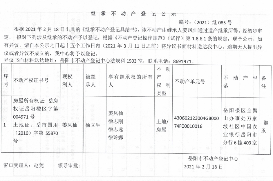 继承不动产登记公示 编号:(2021)继085号(姜凤仙)