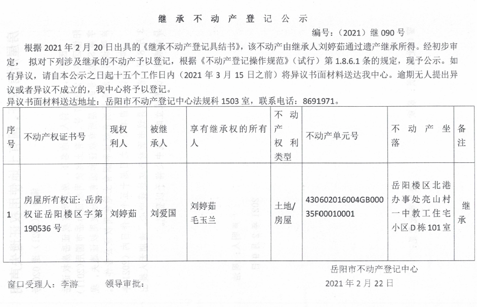 继承不动产登记公示 编号:(2021)继090号(刘婷茹)