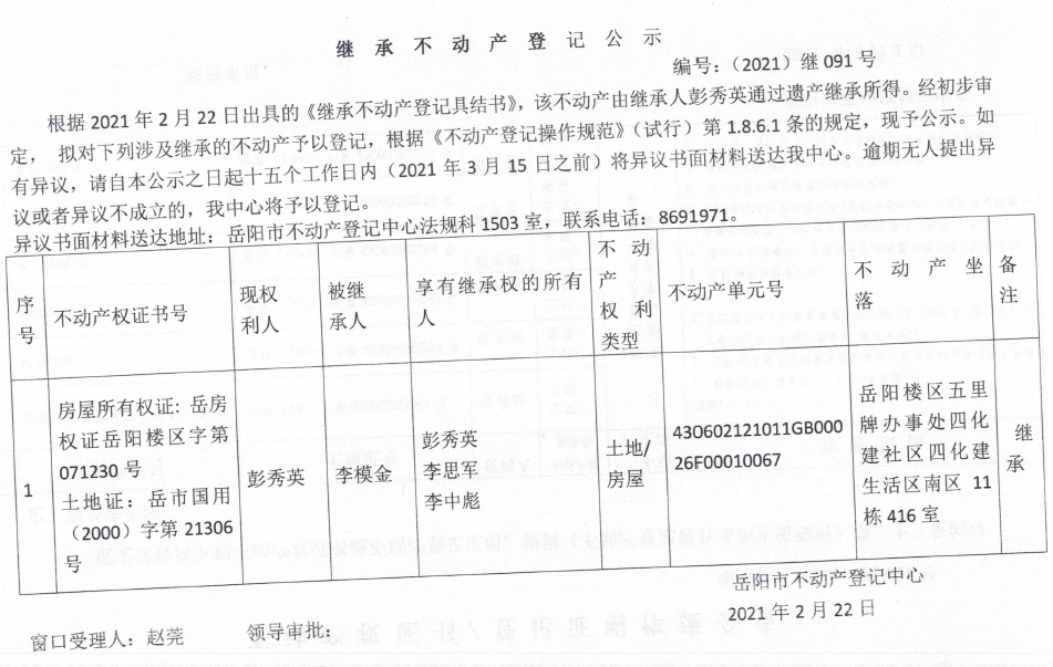 继承不动产登记公示 编号:(2021)继091号(彭秀英)