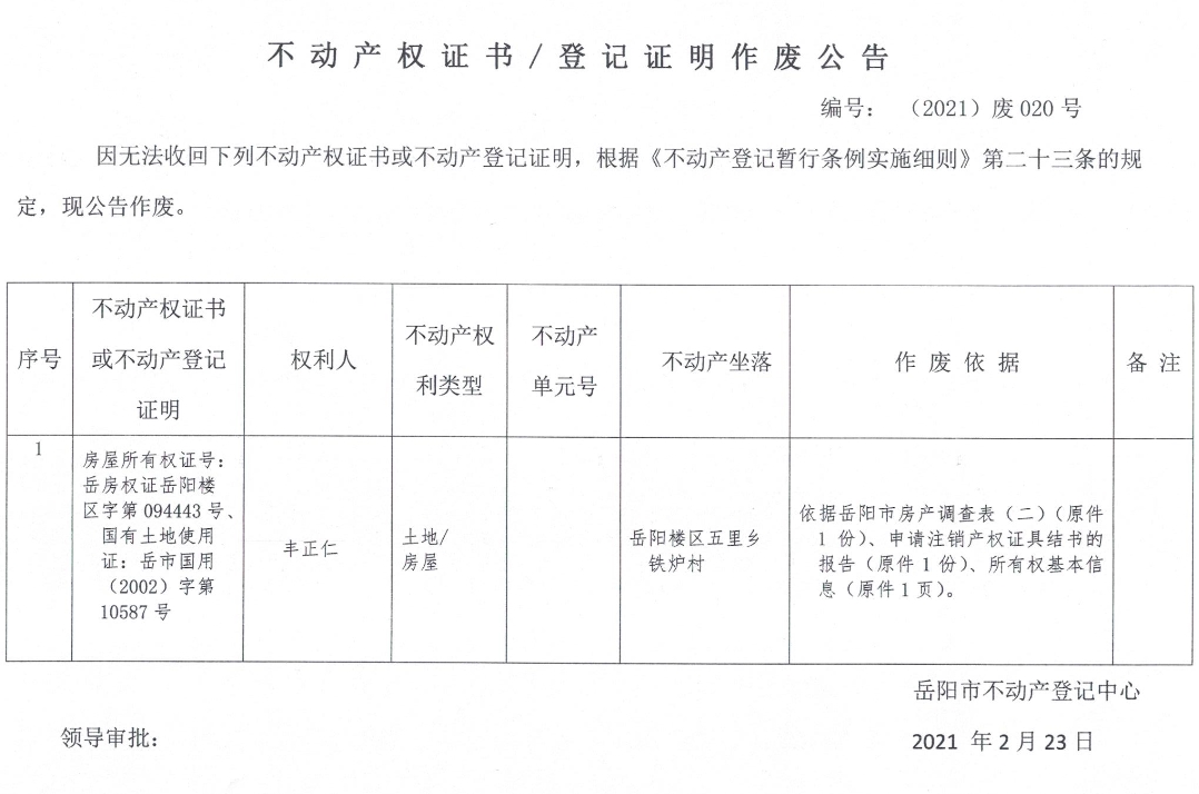 不动产权证书、登记证明作废公告 编号: (2021)废020号(丰正仁)