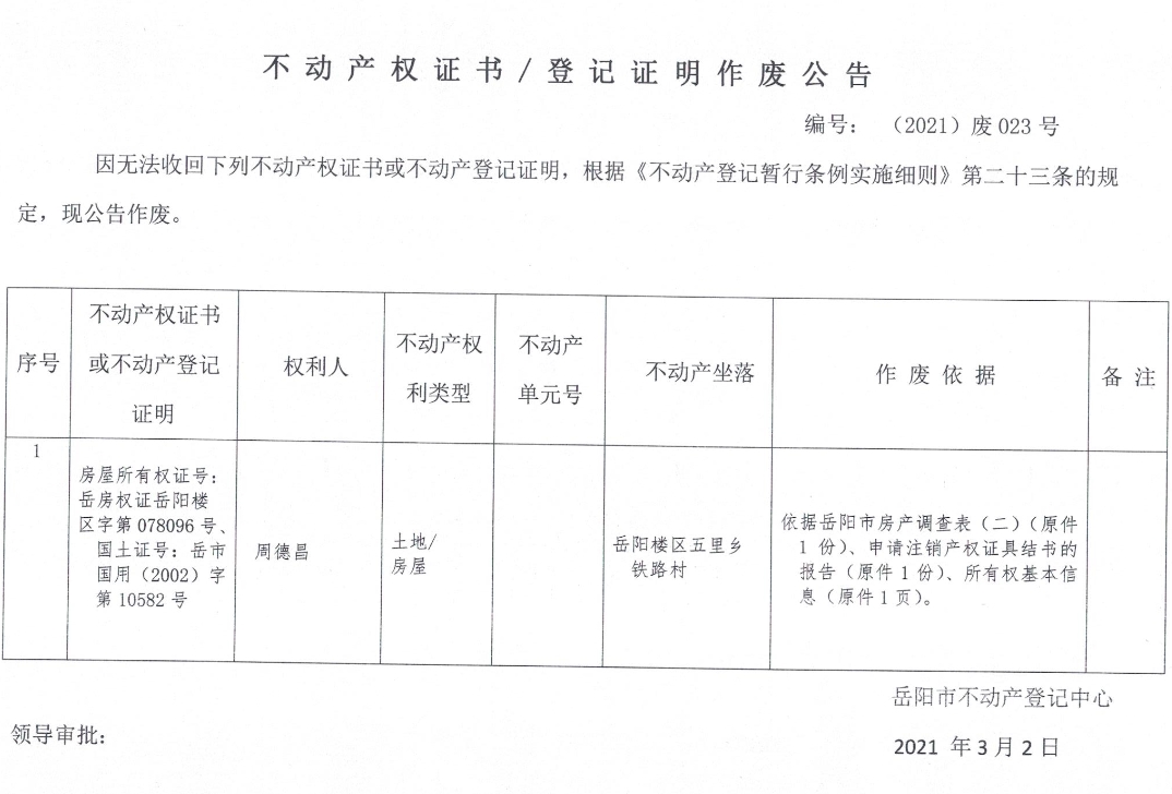 不动产权证书、登记证明作废公告 编号: (2021)废023号(周德昌 )