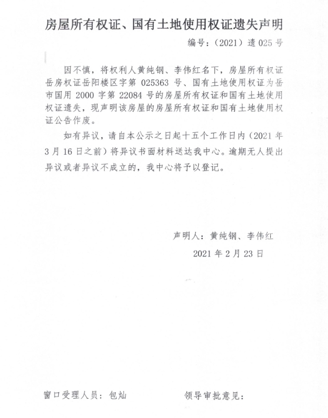 房屋所有权证、国有土地使用权证遗失声明编号:(2021)遗025号(黄纯钢、李伟红)