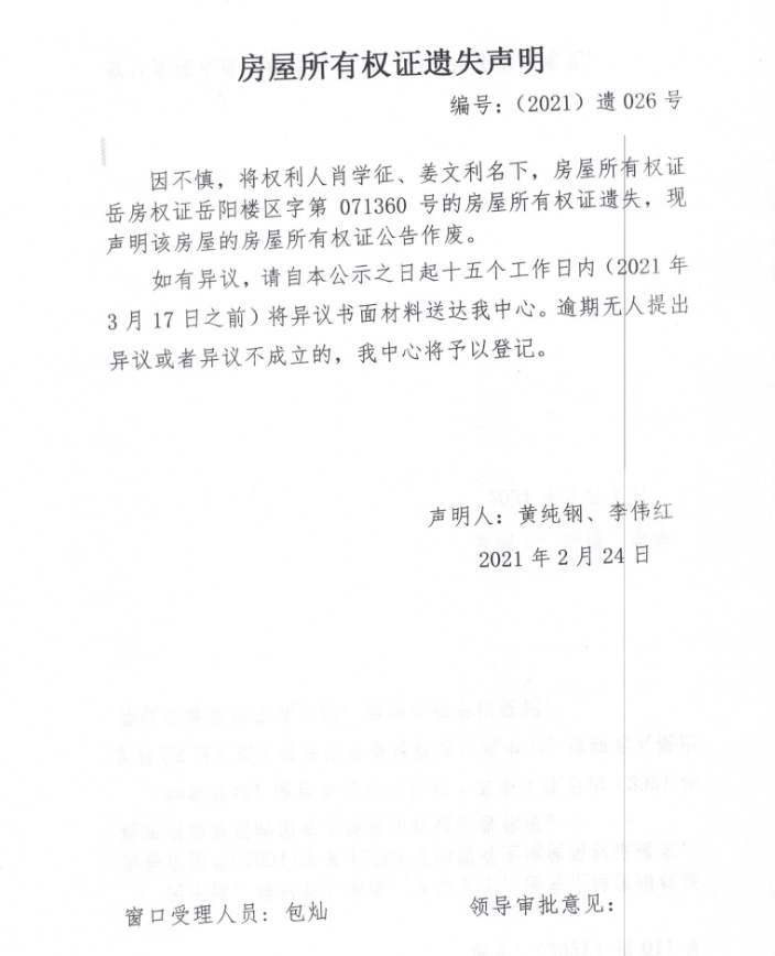 房屋所有权证、国有土地使用权证遗失声明编号:(2021)遗026号(肖学征、姜文利)