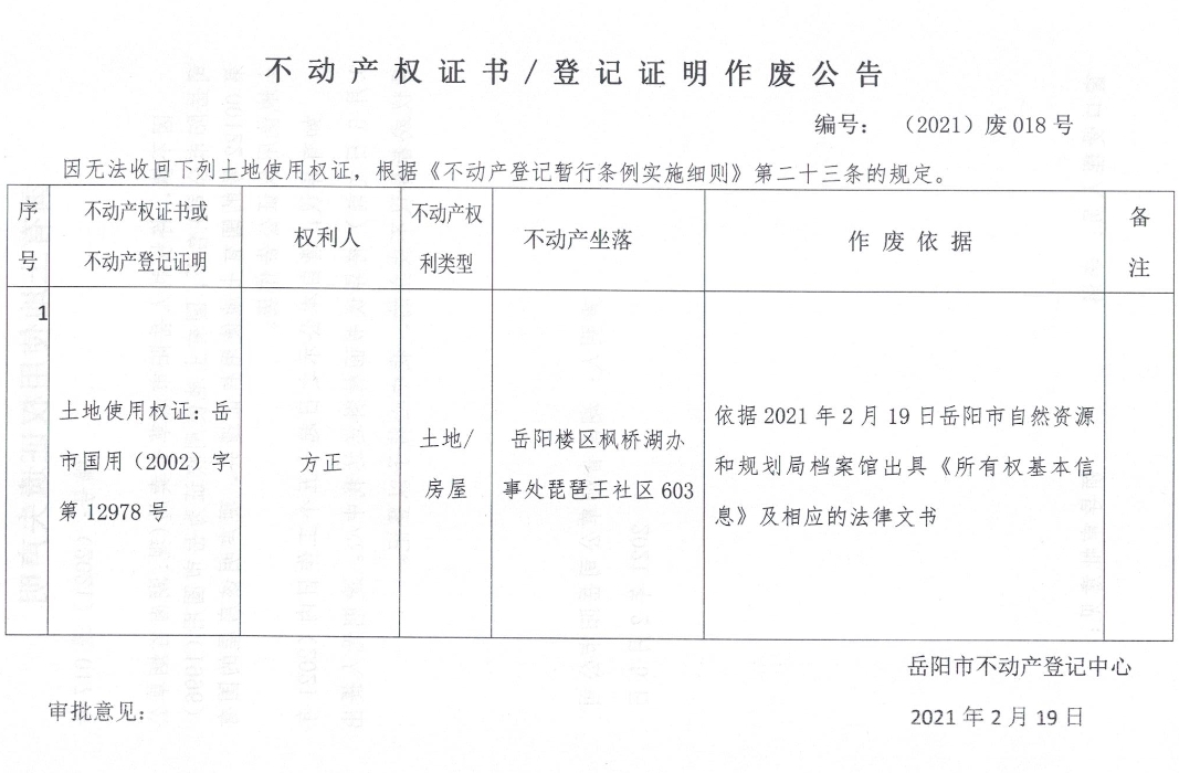 不动产权证书、登记证明作废公告 编号: (2021)废018号(方正)