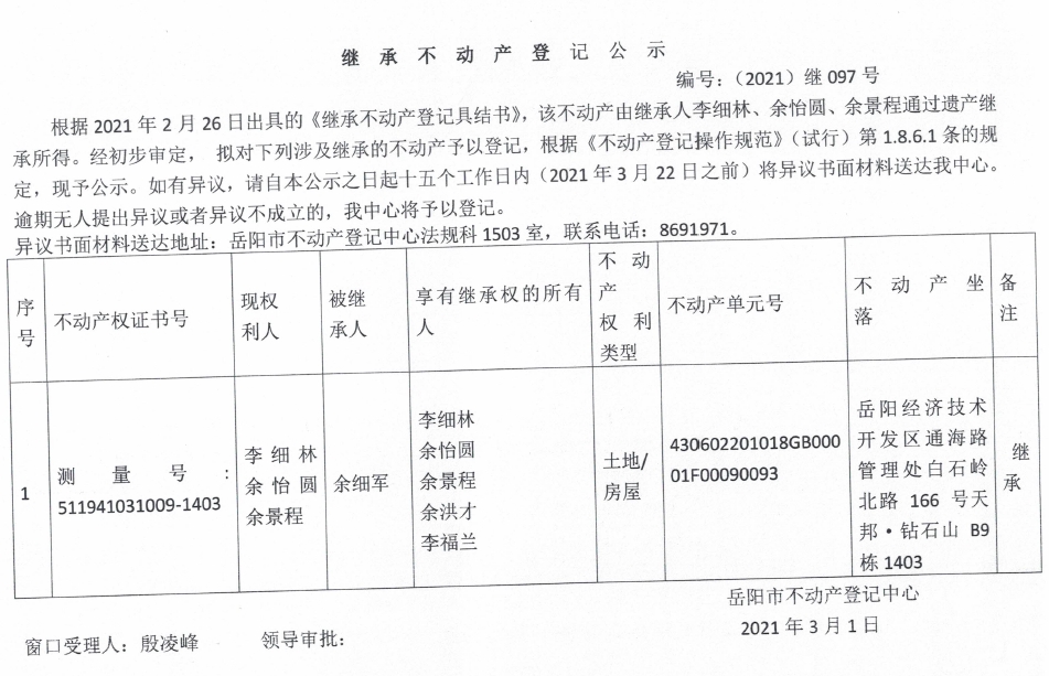 继承不动产登记公示 编号:(2021)继097号(李细林)