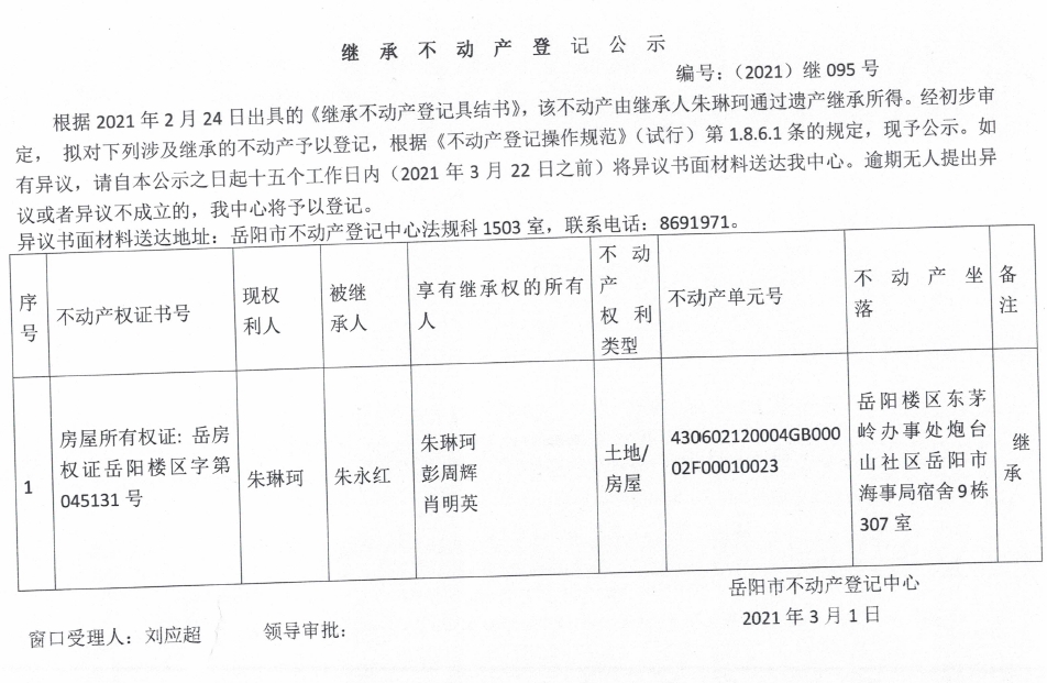 继承不动产登记公示 编号:(2021)继095号(朱琳珂)