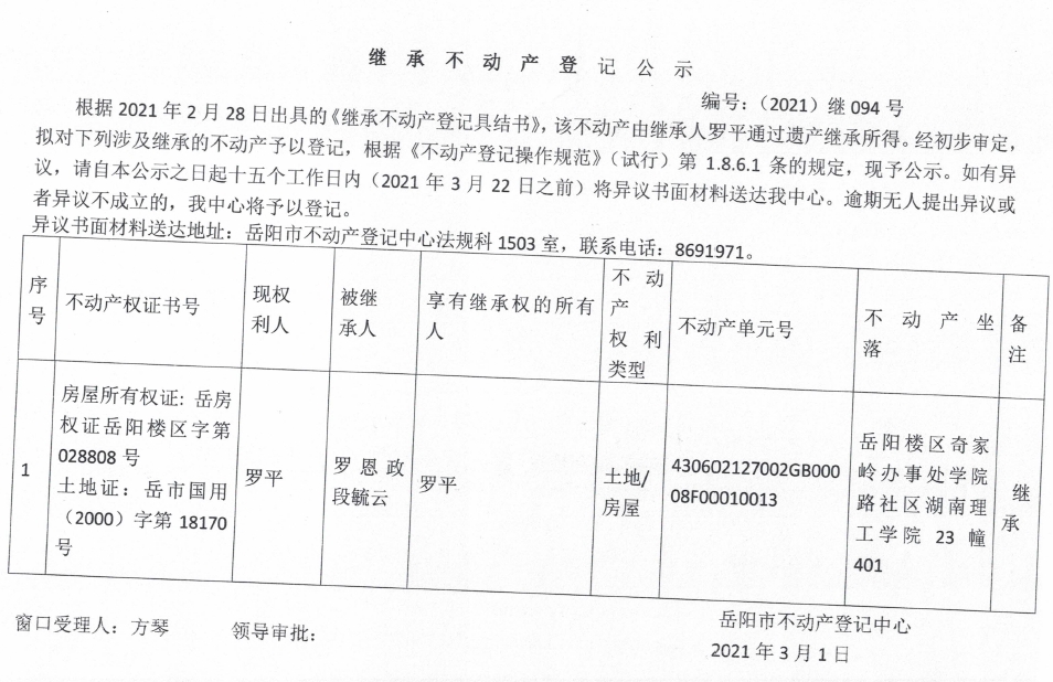 继承不动产登记公示 编号:(2021)继094号(罗平)