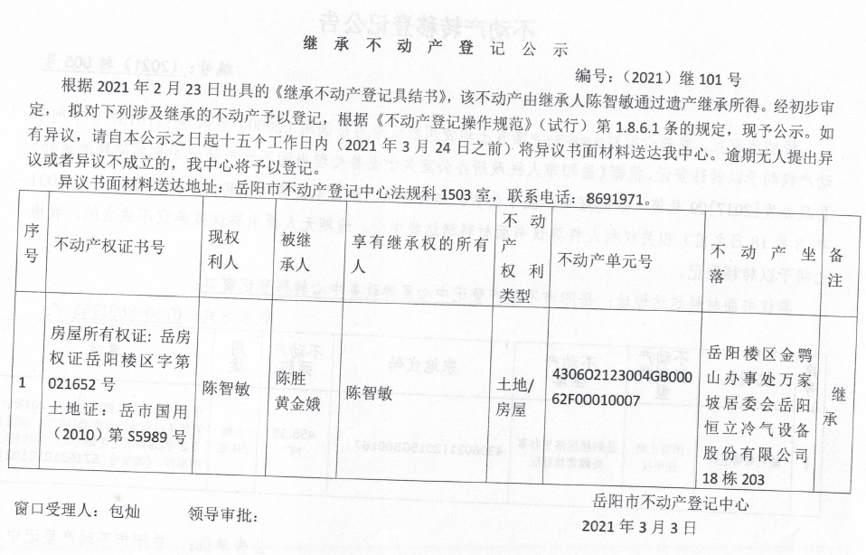 继承不动产登记公示 编号:(2021)继101号(陈智敏)