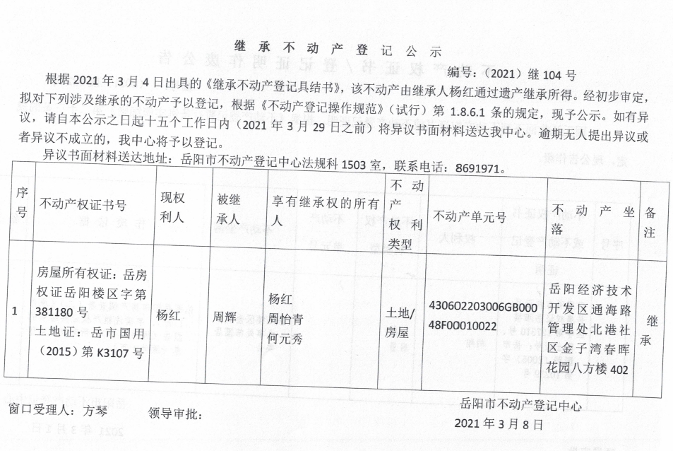 继承不动产登记公示 编号:(2021)继104号(杨红)