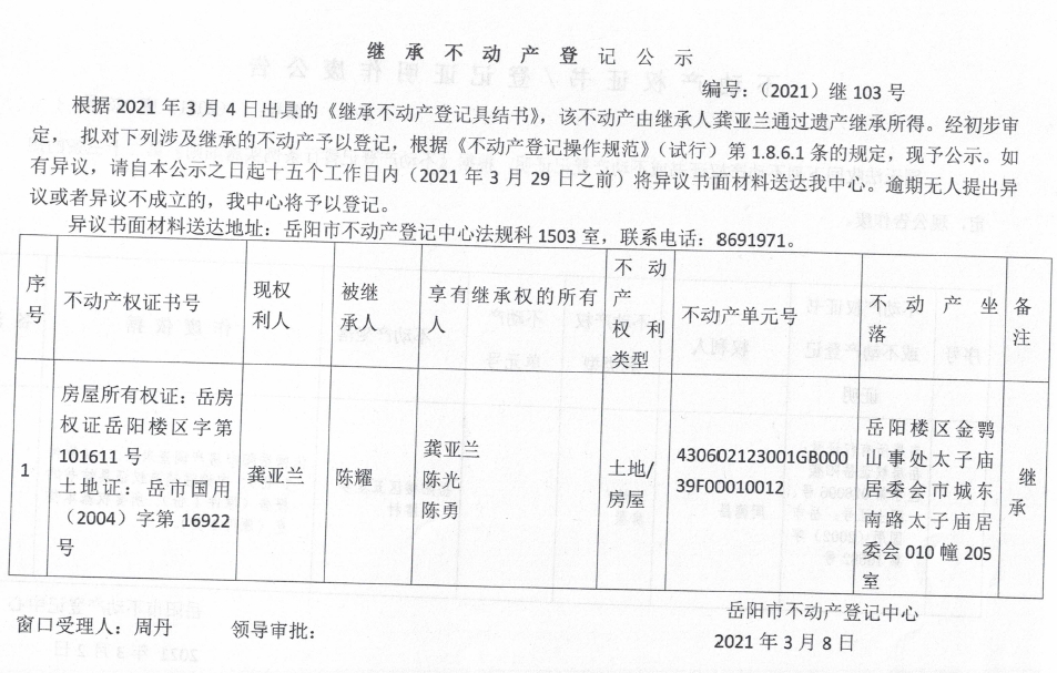 继承不动产登记公示 编号:(2021)继103号(龚亚兰)