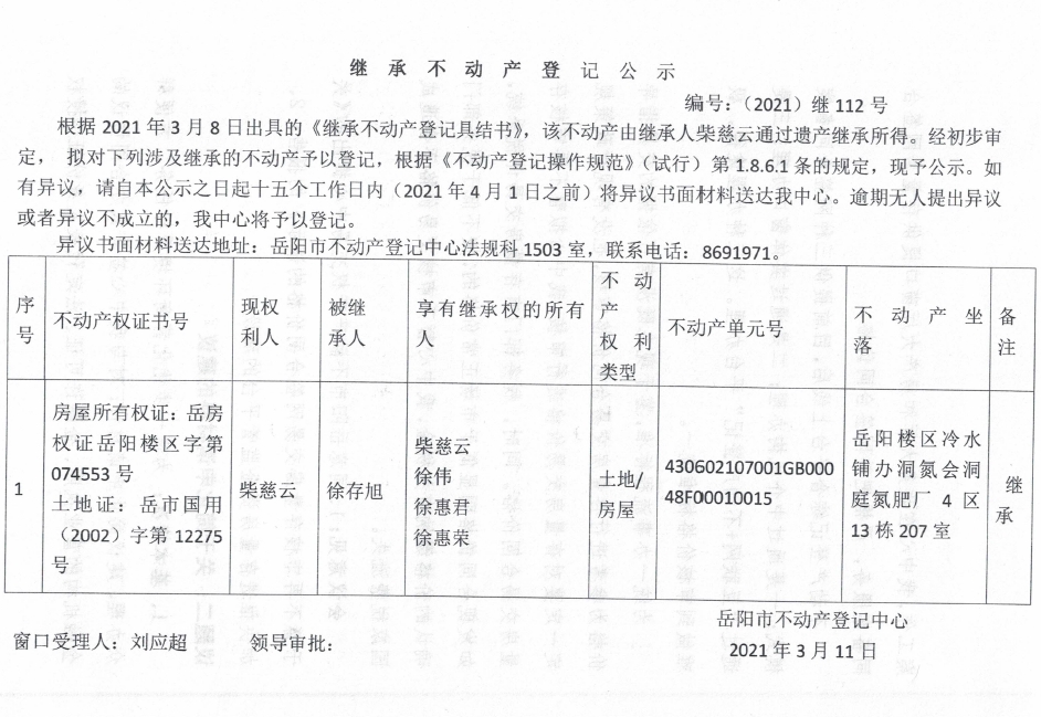 继承不动产登记公示 编号:(2021)继号112(柴慈云)