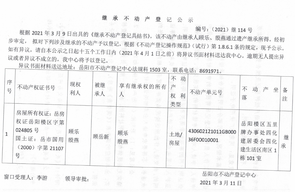 继承不动产登记公示 编号:(2021)继号114(顾乐)
