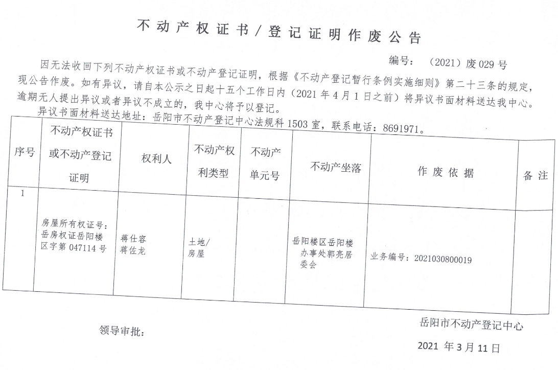 不动产权证书、登记证明作废公告 编号: (2021)废029号(蒋仕容、蒋佐龙)