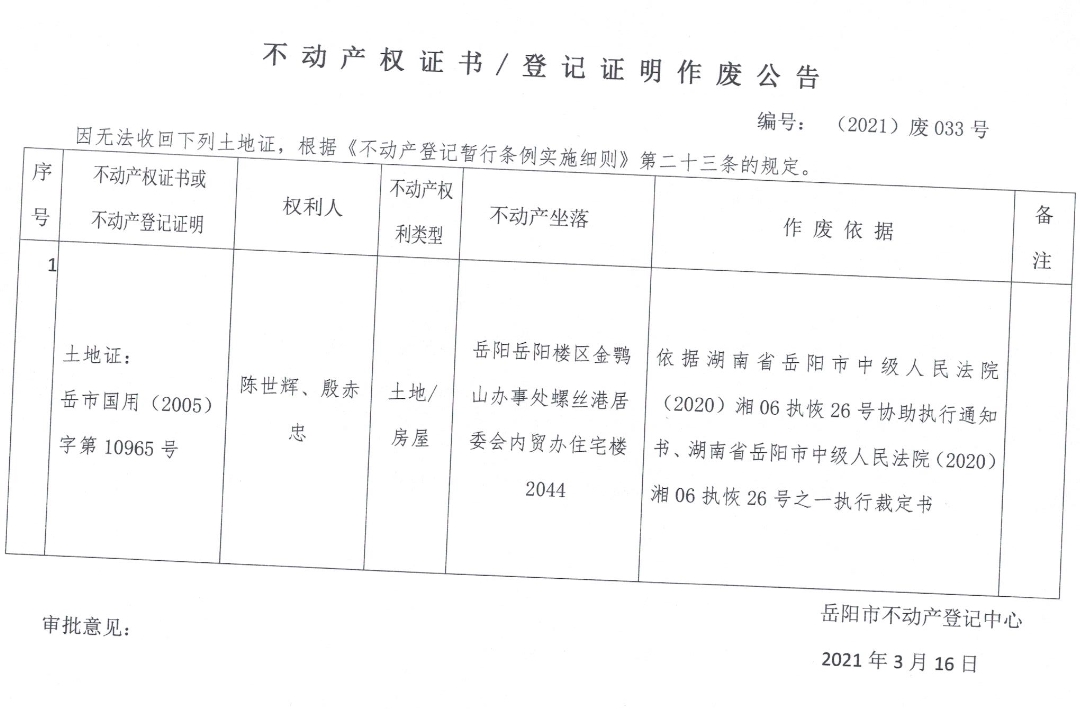 不动产权证书、登记证明作废公告 编号: (2021)废033号(陈世辉、殷赤忠)