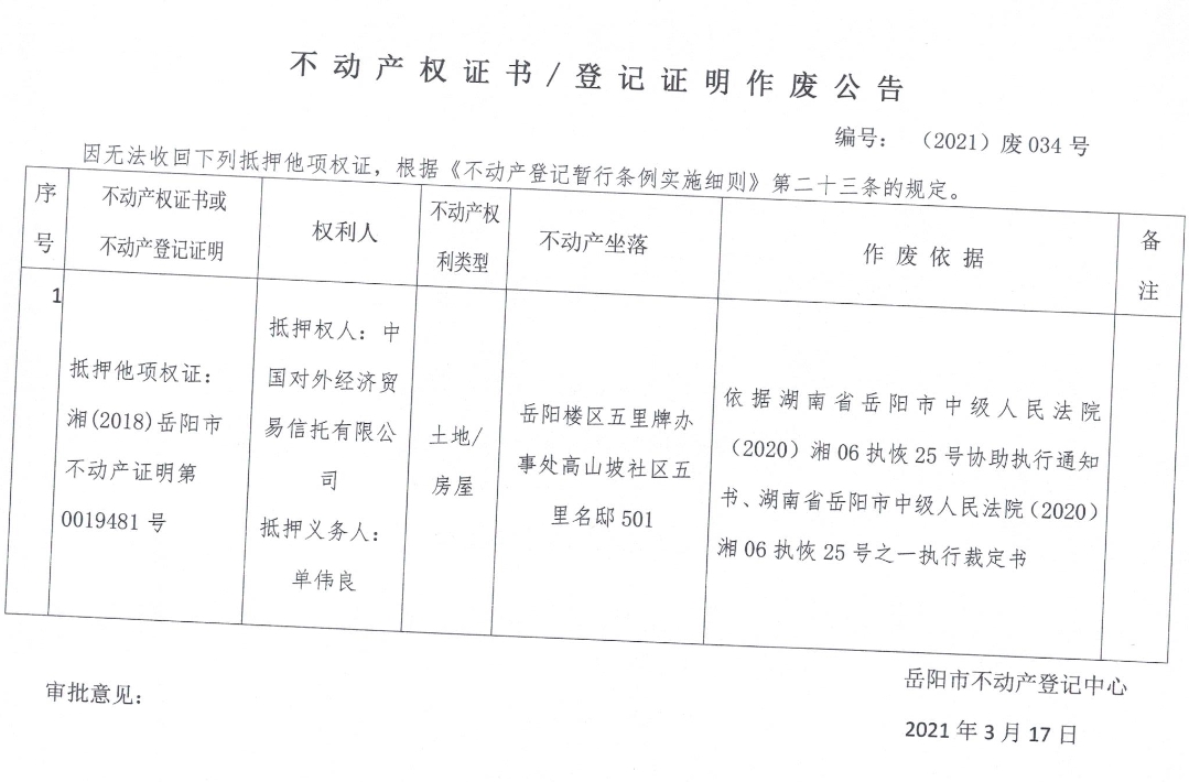 不动产权证书、登记证明作废公告 编号: (2021)废034号(抵押权人中国对外经济贸易信托有限公司;抵押义务人单伟良)