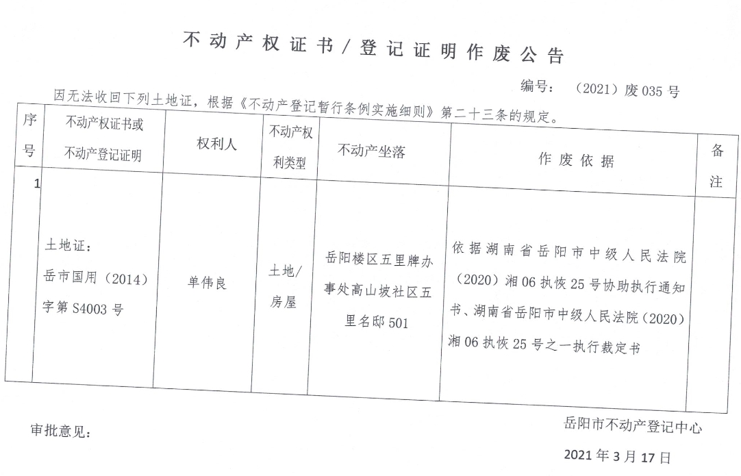不动产权证书、登记证明作废公告 编号: (2021)废035号(单伟良)
