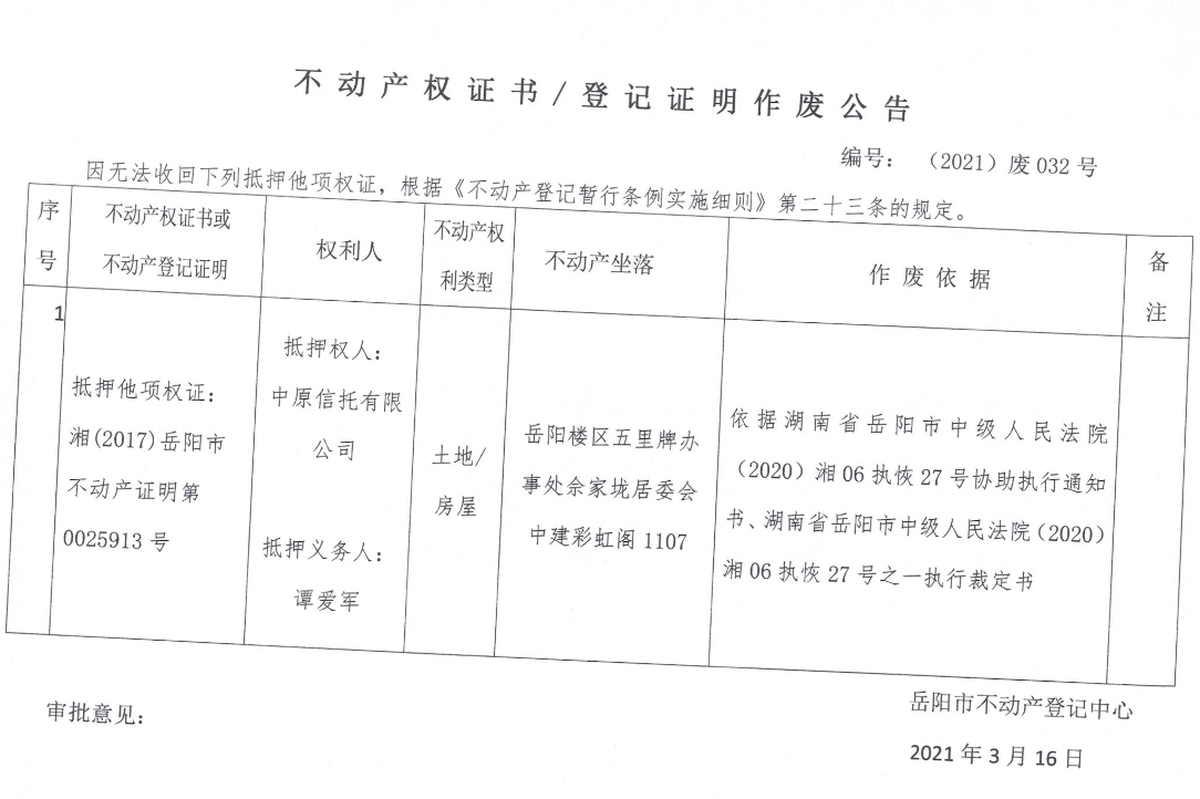 不动产权证书、登记证明作废公告 编号: (2021)废032号(抵押权人中原信托有限公司;抵押义务人 谭爱军)