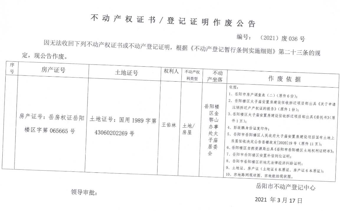 不动产权证书、登记证明作废公告 编号: (2021)废036号(王佑林)