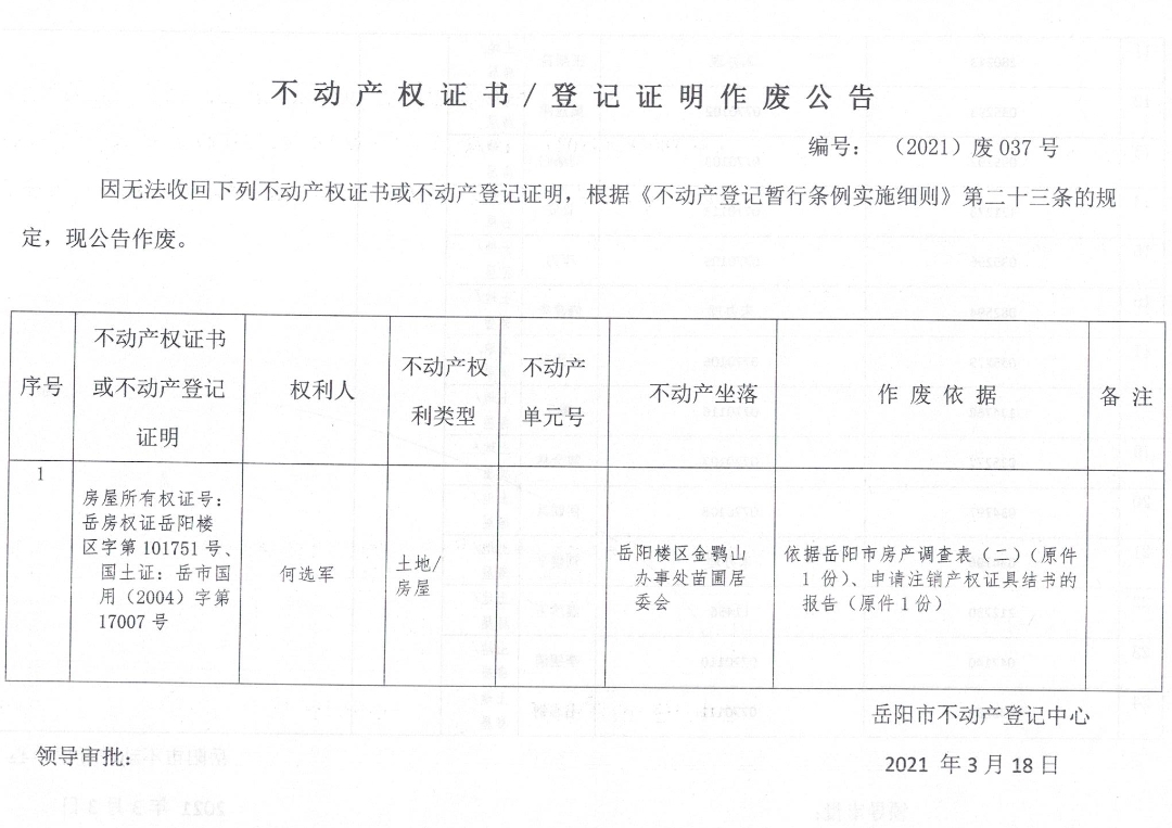 不动产权证书、登记证明作废公告 编号: (2021)废037号(何选军)