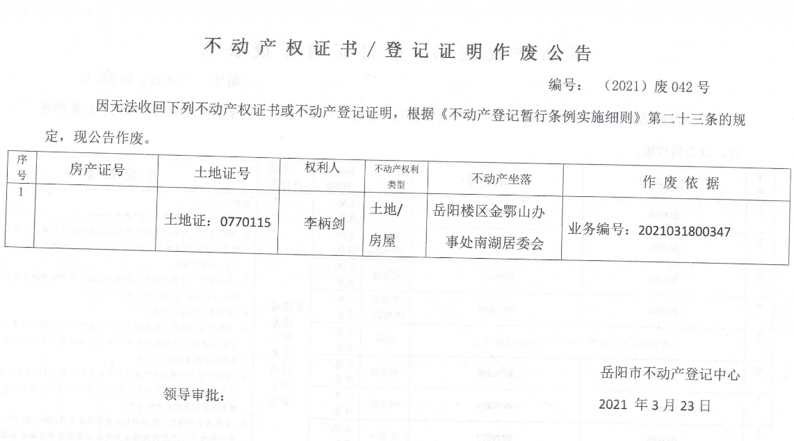 不动产权证书、登记证明作废公告 编号: (2021)废042号(李柄剑)